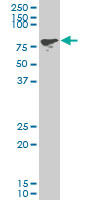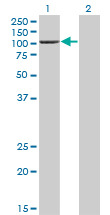 - Western Blot analysis of PCAF expression in transfected 293T cell line by PCAF monoclonal antibody (M02), clone 1H2.Lane 1: PCAF transfected lysate(93 KDa).Lane 2: Non-transfected lysate.