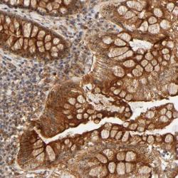- Immunohistochemical staining of human colon shows strong cytoplasmic and nucleolar positivity in glandular cells.