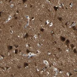 - Immunohistochemical staining of human cerebral cortex shows strong cytoplasmic and nuclear positivity in neuronal cells.