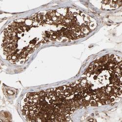 - Immunohistochemical staining of human testis shows strong cytoplasmic positivity in cells in seminiferus ducts.