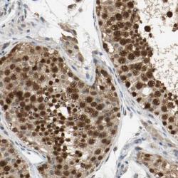 - Immunohistochemical staining of human testis shows strong nuclear positivity in cells in seminiferus ducts.