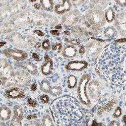- Immunohistochemical staining of human kidney shows strong cytoplasmic positivity in cells in tubule.