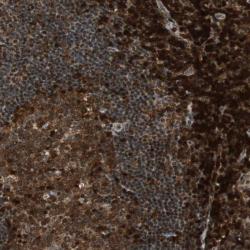 - Immunohistochemical staining of human lymph node shows strong nuclear and cytoplasmic positivity in reaction center cells and lymphoid cells outside reaction centra.