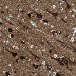 - Immunohistochemical staining of human cerebral cortex shows strong cytoplasmic positivity in neuronal cells.