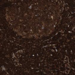- Immunohistochemical staining of human lymph node shows strong cytoplasmic positivity in reaction center cells and lymphoid cells outside reaction centra.