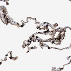 - Immunohistochemical staining of human lung shows strong cytoplasmic positivity in a subset of alveolar cells.