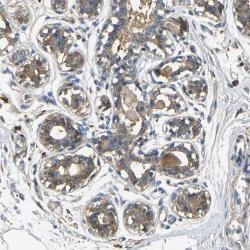 - Immunohistochemical staining of human breast shows moderate cytoplasmic positivity in glandular cells.