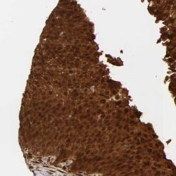 - Immunohistochemical staining of human urinary bladder shows strong cytoplasmic and nuclear positivity in urothelial cells.