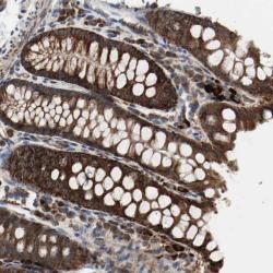 - Immunohistochemical staining of human colon shows strong cytoplasmic positivity in glandular cells.