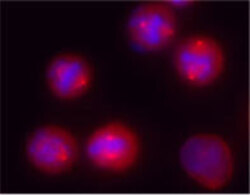 - Overnight nocodazole treated Hela cells stained with purified rabbit polyclonal antibody against -tubulin, followed by Rhodamine Red-X conjugated goat anti-rabbit IgG and DAPI.