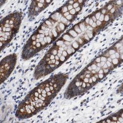 - Immunohistochemical staining of human colon shows strong cytoplasmic positivity in glandular cells.