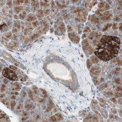 - Immunohistochemical staining of human pancreas shows strong cytoplasmic positivity in islet cells.