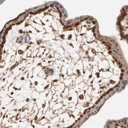 - Immunohistochemical staining of human placenta shows strong cytoplasmic positivity in trophoblastic cells.