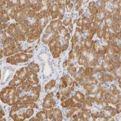- Immunohistochemical staining of human pancreas shows distinct cytoplasmic positivity in exocrine glandular cells.