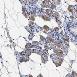- Immunohistochemical staining of human salivary gland shows moderate positivity in subtypes of glandular cells.