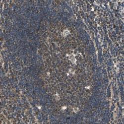 - Immunohistochemical staining of human lymph node shows cytoplasmic positivity in reaction center cells.