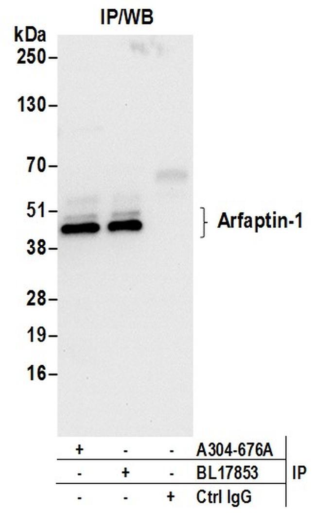 - Detection of human Arfaptin-1 by western blot of immunoprecipitates. Samples: Whole cell lysate (0.5 or 1.0 mg per IP reaction; 20% of IP loaded) from HeLa cells prepared using NETN lysis buffer. Antibodies: Affinity purified rabbit anti-Arfaptin-1 antibody A304-676A (lot A304-676A-1) used for IP at 6 µg per reaction. Arfaptin-1 was also immunoprecipitated by rabbit anti-Arfaptin-1 antibody BL17853. For blotting immunoprecipitated Arfaptin-1, A304-676A was used at 1 µg/ml. Detection: Chemiluminescence with an exposure time of 10 seconds.