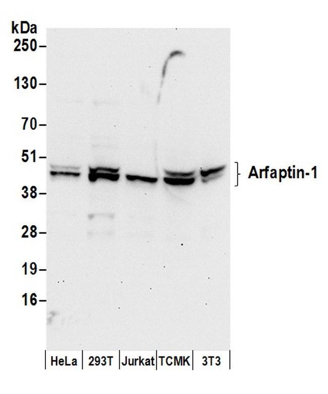 - Detection of human and mouse Arfaptin-1 by western blot. Samples: Whole cell lysate (50 µg) from HeLa, 293T, Jurkat, mouse TCMK-1, and mouse NIH3T3 cells prepared using NETN lysis buffer. Antibodies: Affinity purified rabbit anti-Arfaptin-1 antibody A304-676A (lot A304-676A-1) used for WB at 0.1 µg/ml. Detection: Chemiluminescence with an exposure time of 30 seconds.