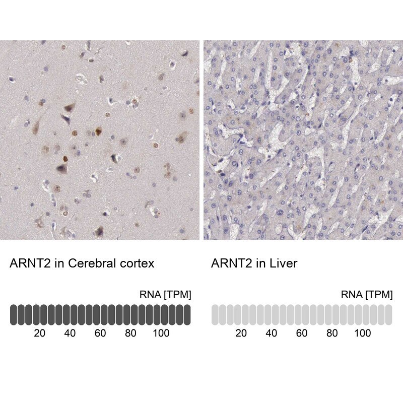 - Immunohistochemical staining of ARNT2 in human cerebral cortex and liver tissues using ARNT2 Polyclonal Antibody (Product # PA5-51504). Corresponding ARNT2 RNA-seq data are presented for the same tissues.