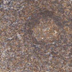- Immunohistochemical staining of human tonsil shows distinct cytoplasmic positivity in reaction center cells.