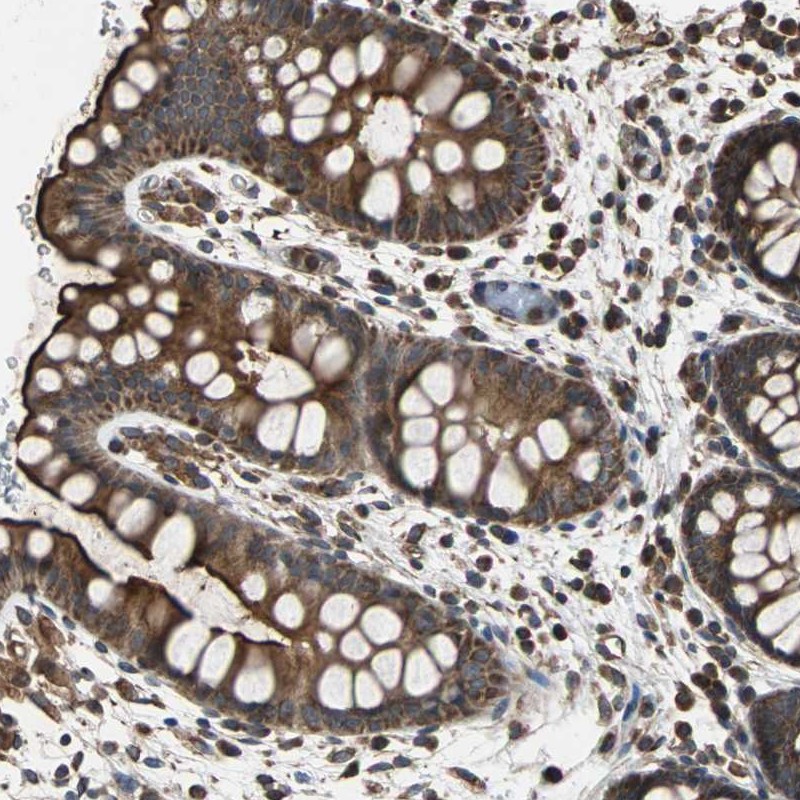 - Immunohistochemical staining of human rectum shows distinct cytoplasmic and membranous positivity in glandular cells.
