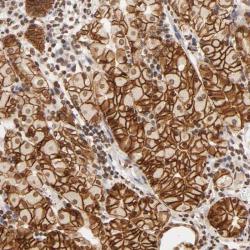 - Immunohistochemical staining of human stomach shows distinct membranous and nuclear positivity in glandular cells.