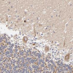 - Immunohistochemical staining of human cerebellum shows cytoplasmic positivity in Purkinje cells.