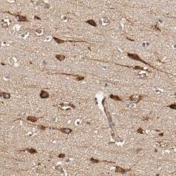 - Immunohistochemical staining of human cerebral cortex shows strong cytoplasmic positivity in neuronal cells.