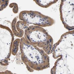 - Immunohistochemical staining of human placenta shows cytoplasmic positivity in syncytiotrophoblastic cells.