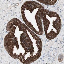 - Immunohistochemical staining of human prostate shows strong cytoplasmic positivity in glandular cells.