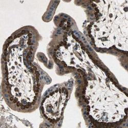 - Immunohistochemical staining of human placenta shows strong cytoplasmic positivity in trophoblastic cells.