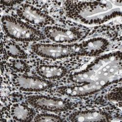 - Immunohistochemical staining of human small intestine shows strong nuclear positivity in glandular cells.