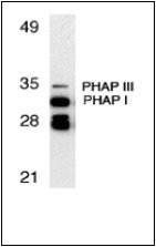 - PHAP antibody was raised with a synthetic peptide corresponding to amino acids atcarboxy terminus of human PHAP I.