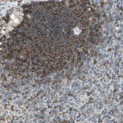 - Immunohistochemical staining of human spleen shows strong cytoplasmic positivity in cells in white pulp.