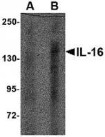 - Western blot analysis of IL-16 in rat brain tissue lysate with IL-16 antibody at (A) 1 ug/ml and (B) 2 ug/mL.