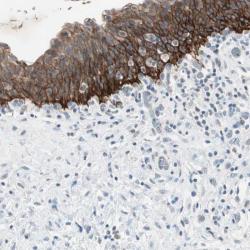 - Immunohistochemical staining of human urinary bladder shows distinct membranous and cytoplasmic positivity in urothelial cells.