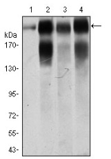 - Western blot analysis using ITGB4 mouse mAb against A549 (1), A431 (2), MCF-7 (3) and SW620 (4) cell lysate.