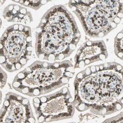 - Immunohistochemical staining of human small intestine shows nuclear membranous positivity in glandular cells.