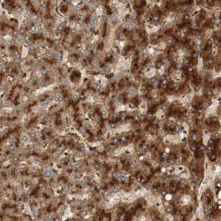 - Immunohistochemical staining of human liver shows strong cytoplasmic positivity in hepatocytes.
