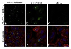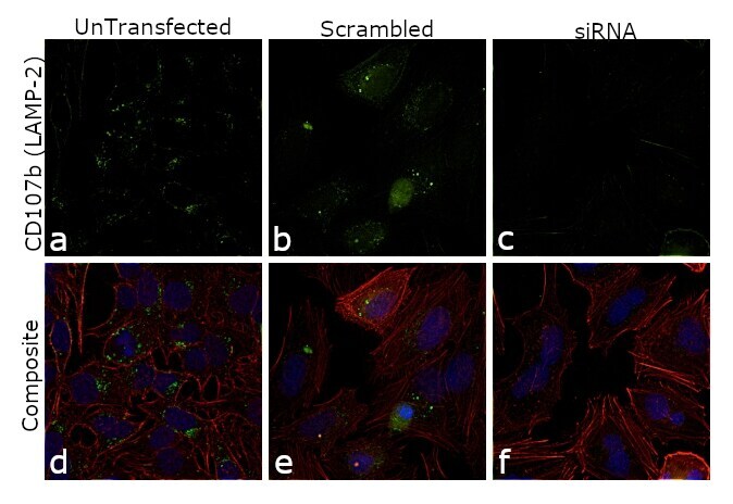 - Knockdown of CD107b (LAMP2) was achieved by transfecting HeLa cells with CD107b (LAMP2) specific siRNAs (Silencer® select Product # s533069, s8086 ). Immunofluorescence analysis was performed using untransfected HeLa cells (panels a, d), transfected with non-specific scrambled siRNA (panels b,e) and transfected with CD107b (LAMP2) specific siRNAs (panel c,f). Cells were fixed, permeabilized, and probed with CD107b (LAMP-2) Monoclonal Antibody (eBioH4B4 (H4B4)), FITC, eBioscience™ (Product # 11-1078-41, 1:250 dilution). Nuclei (blue) were stained using ProLong™ Diamond Antifade Mountant with DAPI (Product # P36962) and Rhodamine Phalloidin (Product # R415, 1:300) was used for cytoskeletal F-actin (red) staining. Reduction of specific cytoplasmic localization was observed upon siRNA mediated knockdown (panel c,f) confirming specificity of the antibody to CD107b (LAMP2). The images were captured at 60X magnification.