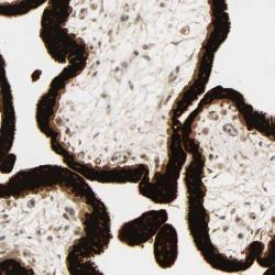 - Immunohistochemical staining of human placenta shows strong cytoplasmic positivity in trophoblastic cells.