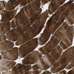 - Immunohistochemical staining of human skeletal muscle shows strong cytoplasmic positivity in myocytes.