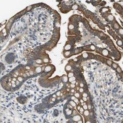 - Immunohistochemical staining of human small intestine shows strong cytoplasmic and membranous positivity in glandular cells.