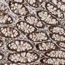 - Immunohistochemical staining of human colon shows strong cytoplasmic positivity in glandular cells.