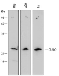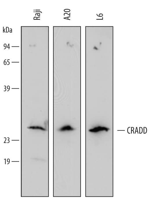 - Western Blot analysis of RAIDD in Raji, A20, and L6 using RAIDD polyclonal antibody (Product # PA5-148883).