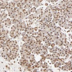 - Immunohistochemical staining of human pancreas shows distinct nuclear positivity in exocrine glandular cells.