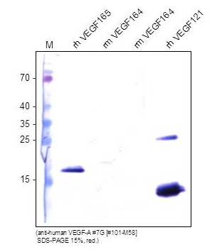 - Figure 1. Western analysis of recombinant human VEGF165, mouse VEGFG164 and human VEGF121 using a monoclonal mouse anti-human VEGF-A antibody [Cat# 101-M58]. There is no cross reactivity with mouse VEGF164.