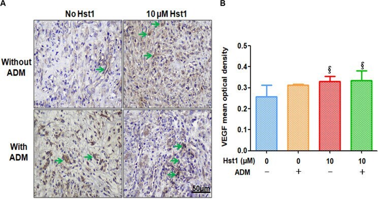 - FIGURE 5 Immunohistochemical evaluation of angiogenic marker VEGF positive expression. (A) 14 days post-surgery, the positive expression level of VEGF (in green arrows) in the 10 muM Hst1 group was higher. The scale bar = 50 mum. (B) Quantitative analysis of the VEGF expression level at wound sites. 14 days post-surgery, the VEGF expression in the groups of 10 muM Hst1 and ADM + 10 muM Hst1 was significantly higher compared with the control group and ADM group. SS: The 10 muM Hst1 group and 10 muM Hst1 + ADM group vs the control group ( P < 0.05).