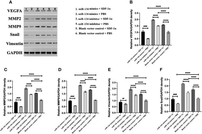 - Figure 4 The expression of VEGFA and proliferation/invasion-related downstream protein of alphaT3-1 cells. (A) Schematic diagram of the target protein band. (B) The quantification of VEGFA expressions using western blot analysis. (C) The quantification of MMP2 expressions using western blot analysis. (D) The quantification of MMP9 expressions using western blot analysis. (E) The quantification of Vimentin expressions using western blot analysis. (F) The quantification of Snail expressions using western blot analysis. Data were represented as means +- SD (n = 5). #### p < 0.0001 and ## p < 0.01 vs. miR-134 mimics + PBS group. &&&& p < 0.0001 vs. miR-134 inhibitor + PBS group. **** p < 0.0001 vs. black vector control + PBS group.