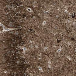 - Immunohistochemical staining of human hippocampus shows strong cytoplasmic positivity in neuronal cells.